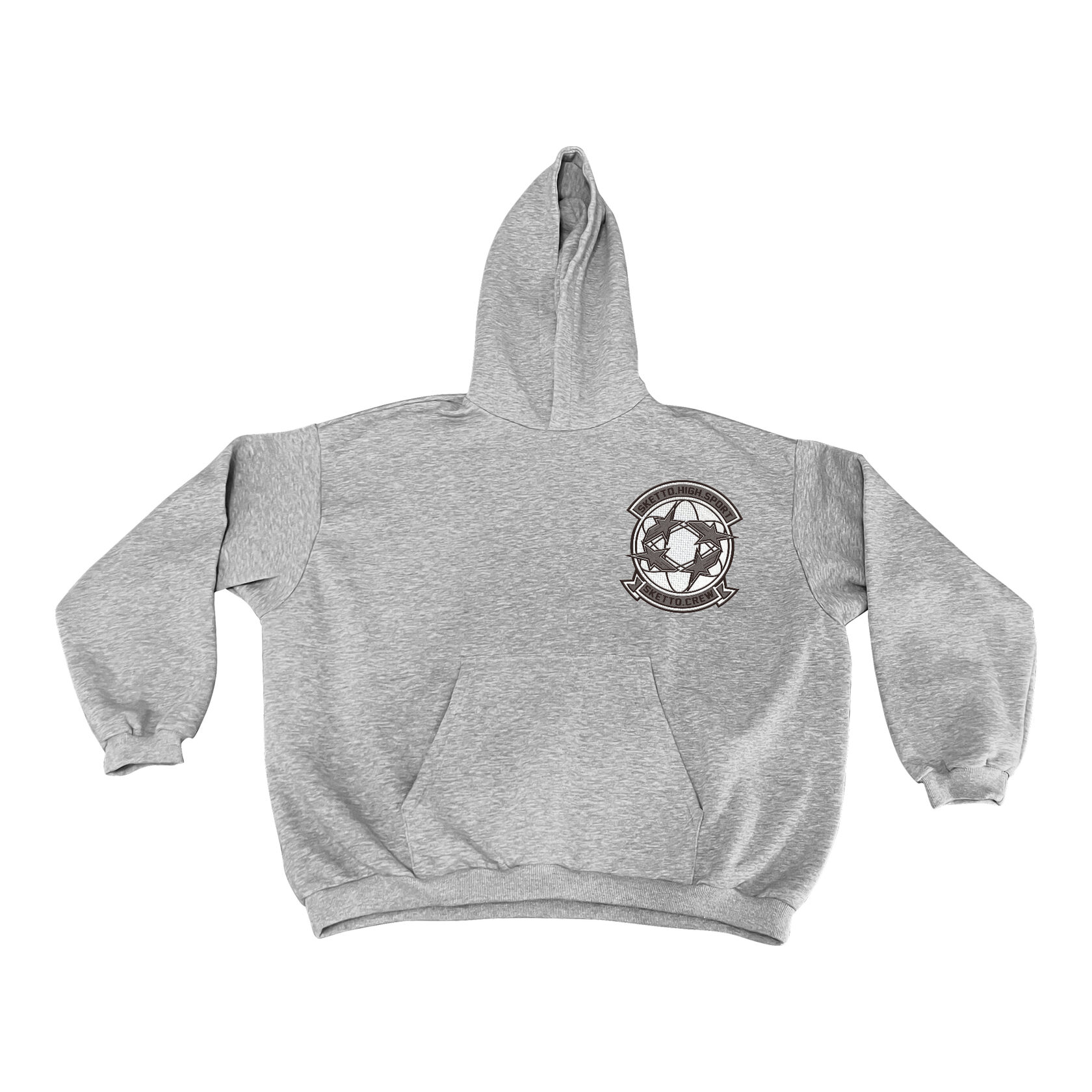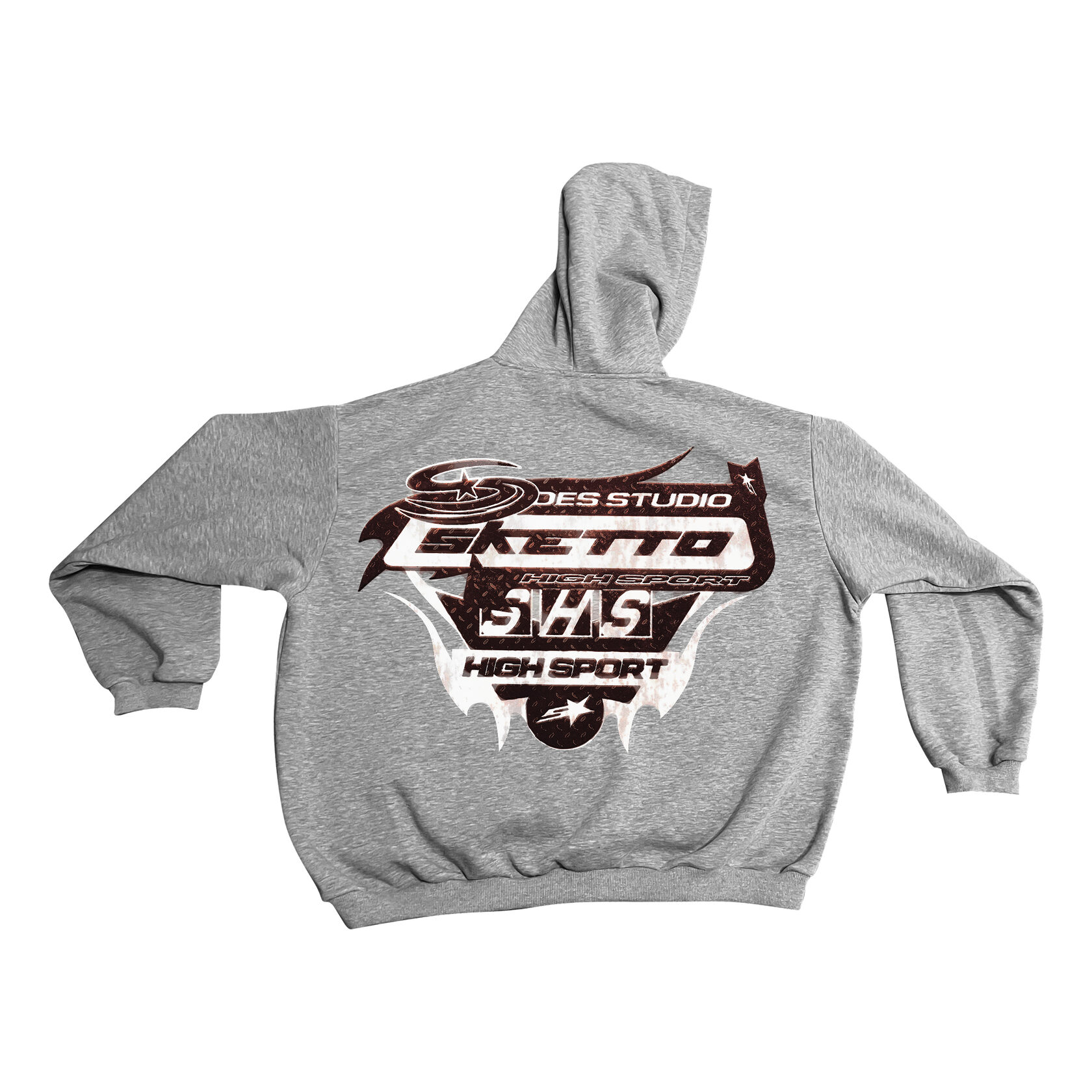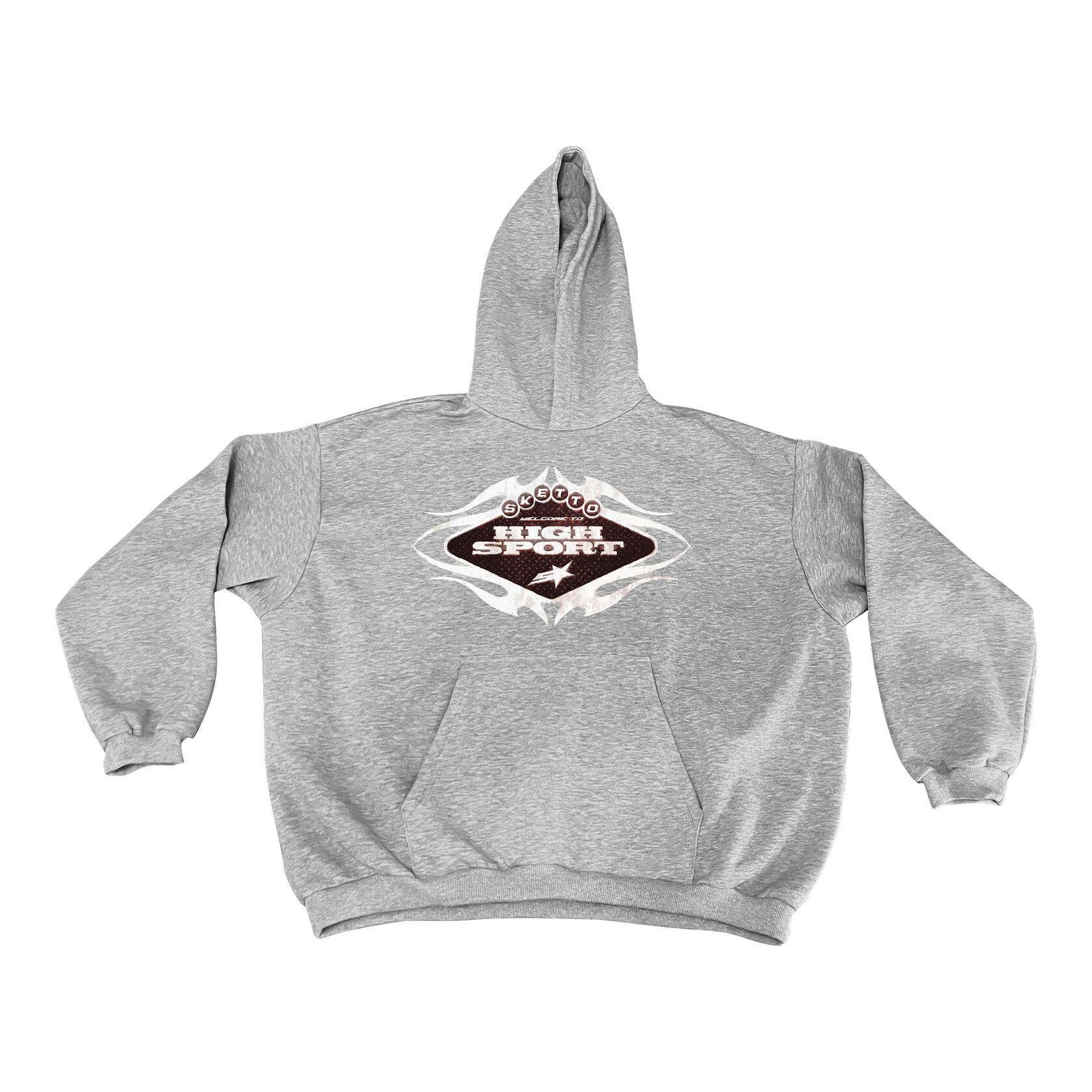 Круглая эмблема с надписью Sketto Gasoline будто от старого дорожного знака. В ней чувствуется запах пустых трасс и заправок, ставших ориентиром на пути через ничто.